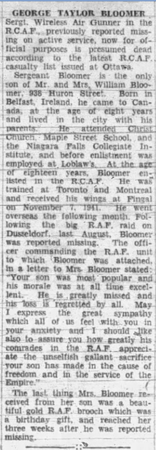 Fils de William James et Ellen Jane Bloomer, de Niagara Falls, Ontario Canada.