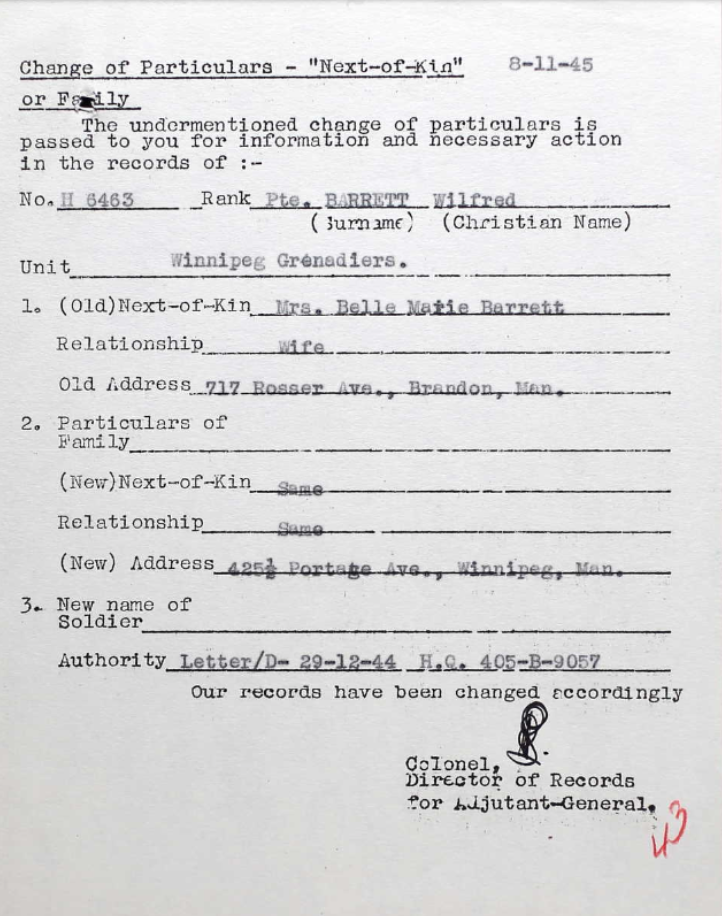 Wilfred a servi au Manitoba, en Jamaïque avec la Force Y, à Hong Kong avec la Force C. Il comptait 830 jours de service, dont 59 outremer.