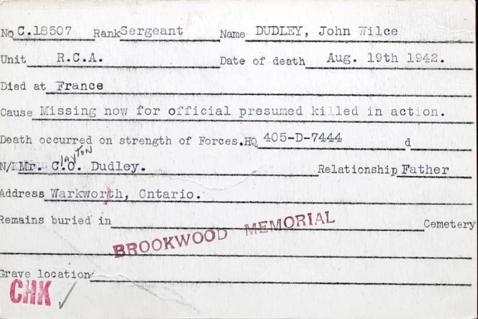 Les noms de plus de 200 Canadiens sont enregistrés au Mémorial de Brookwood. Quelques-uns sont morts sur des navires qui ont été coulés en dehors des eaux territoriales des principales campagnes. D'autres ont été projetés par-dessus bord et d'autres, enfin, sont morts de diverses causes à bord de navires-hôpitaux ou de transporteurs de troupes et ont été inhumés en mer. Le Mémorial honore également les noms de ceux qui sont morts pendant la campagne de Norvège en 1940 et les raids effectués sur le territoire occupé par l'ennemi en Europe, y compris l'opération coûteuse contre Dieppe en août 1942.