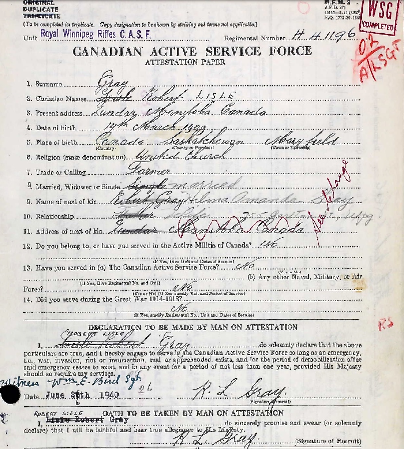 Fils de Robert et Pearl Gray. Époux Hilma Gray de Winnipeg, Manitoba.
