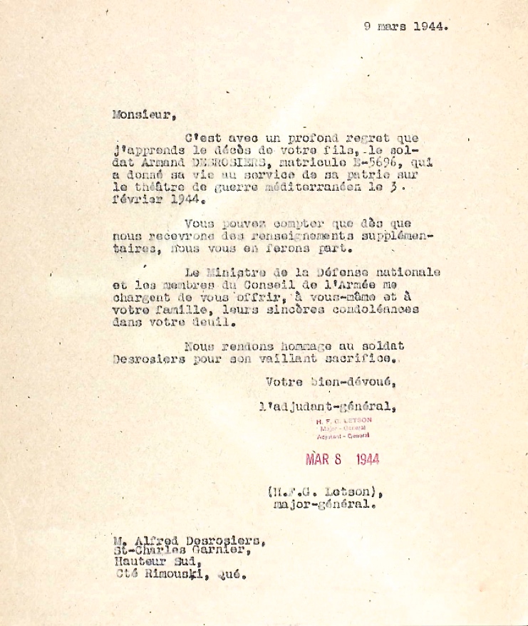 À Halifax, Nouvelle-Écosse, le 15 juillet 1940 il s’embarque pour la Grande-Bretagne où il débarque le 1er août à Glasgow, Écosse. Il est temporairement prêté au 1st Anti-Tank Regiment de la Royal Canadian Artillery du 1er mai au 14 juin 1943. Le 15, avec le Royal 22e Régiment, il reprend la mer pour participer l’opération Husky qui est le débarquement allié en Sicile. Il débarque le 10 juillet suivant avec la Force M. Le 10 septembre, il met pied sur le continent italien. Le 31 janvier 1944, il est hospitalisé pour une hépatite. Il décède de la jaunisse le 3 février 1944 au 1st Canadian General Hospital à Barletta où il est inhumé dans la fosse numéro F-8. Le 10 février 1945, son corps sera exhumé et remis en terre au cimetière militaire canadien à Bari dans la fosse numéro III.C.39.