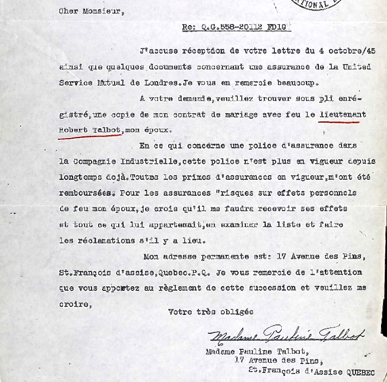 Fils de Leo et Marie Louise Richard Talbot, de la ville de Québec. Époux de Pauline Talbot, de la ville de Québec.