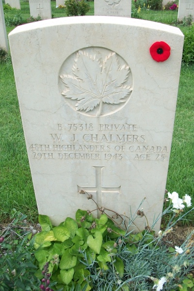 Pendant l'hiver de 1943, les armées allemandes en Italie défendaient une ligne qui s'étendait depuis la mer Thyrénéenne au nord de Naples, jusqu'à l'Adriatique au sud d'Ortona. L'objectif des Alliés consistait à enfoncer cette ligne et à s'emparer de Rome. De son côté, la 1re Division de l'infanterie canadienne devait franchir la rivière Moro et s'emparer d'Ortona. En janvier 1944, les Corps d'armée canadien choisit ce site, afin d'y inhumer ceux qui périrent au cours de la bataille d'Ortona et des combats livrés pendant les semaines qui l'avaient précédée et suivie. Aujourd'hui, on y trouve 1 651 sépultures dont plus de 50 non identifiées et celles de 1 375 Canadiens.