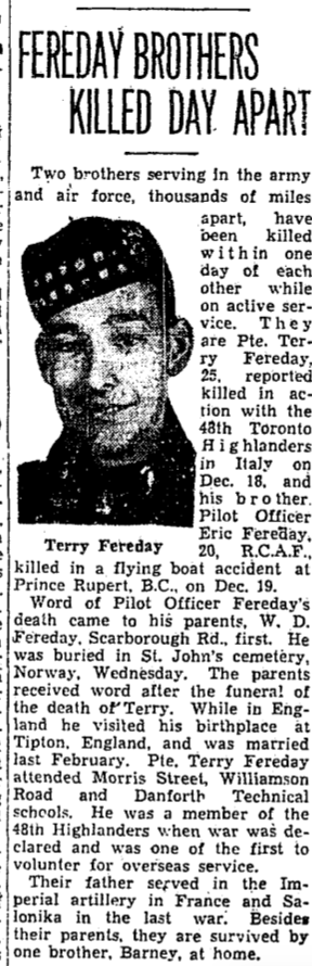 Frère du sous-lieutenant d'aviation Eric Joseph Fereday, décédé au service du Royal Canadian Air Force.