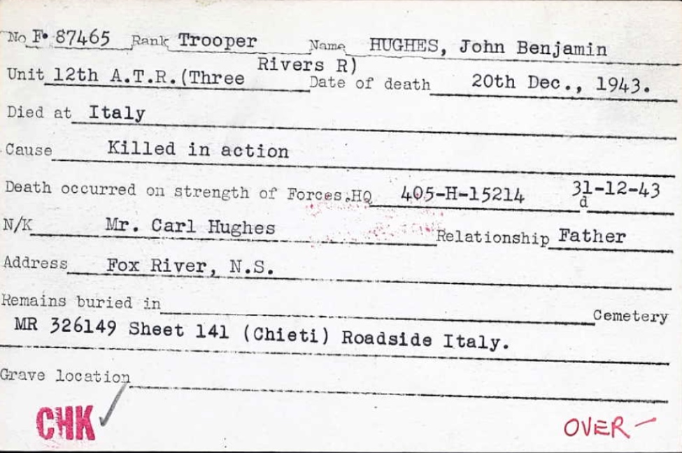 Pendant l'hiver de 1943, les armées allemandes en Italie défendaient une ligne qui s'étendait depuis la mer Thyrénéenne au nord de Naples, jusqu'à l'Adriatique au sud d'Ortona. L'objectif des Alliés consistait à enfoncer cette ligne et à s'emparer de Rome. De son côté, la 1re Division de l'infanterie canadienne devait franchir la rivière Moro et s'emparer d'Ortona. En janvier 1944, les Corps d'armée canadien choisit ce site, afin d'y inhumer ceux qui périrent au cours de la bataille d'Ortona et des combats livrés pendant les semaines qui l'avaient précédée et suivie. Aujourd'hui, on y trouve 1 651 sépultures dont plus de 50 non identifiées et celles de 1 375 Canadiens.