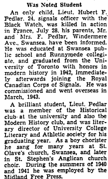 Fils de Frederick et Frances Ann Pedlar, de Toronto, Ontario. B.A. Hons. (University de Toronto).