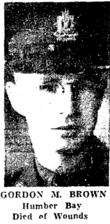 Gordon M. Brown était membre du Royal Canadian Infantry Corps et il est mort alors qu'il était au service du Lancashire Fusiliers à titre d'officier « CANLOAN ».