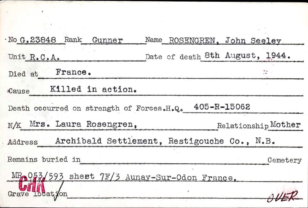Neveu du caporal Andrew Rosengren, décédé le 14 septembre 1947 pendant qu’il servait dans le Westminster Regiment (Motor).