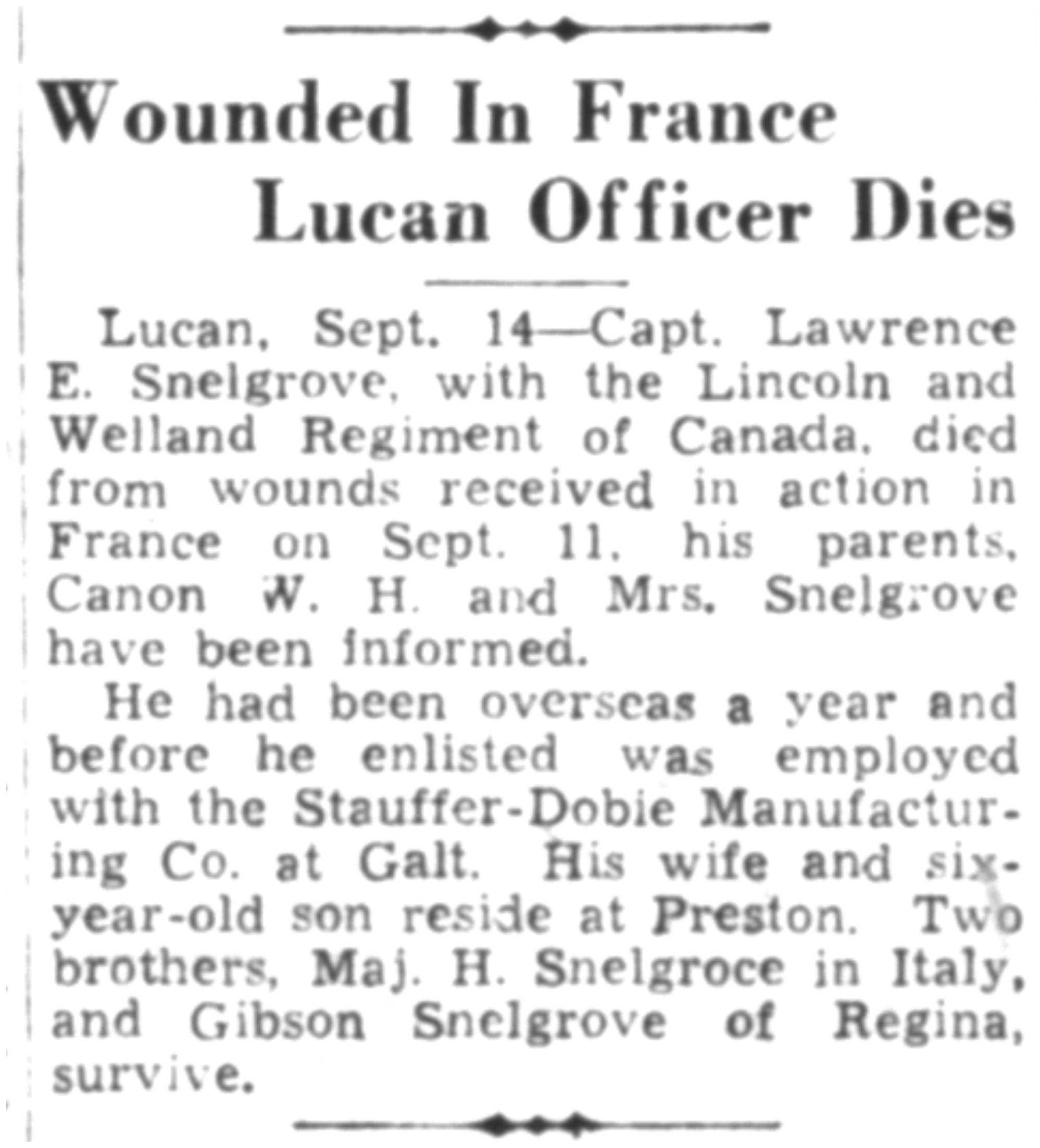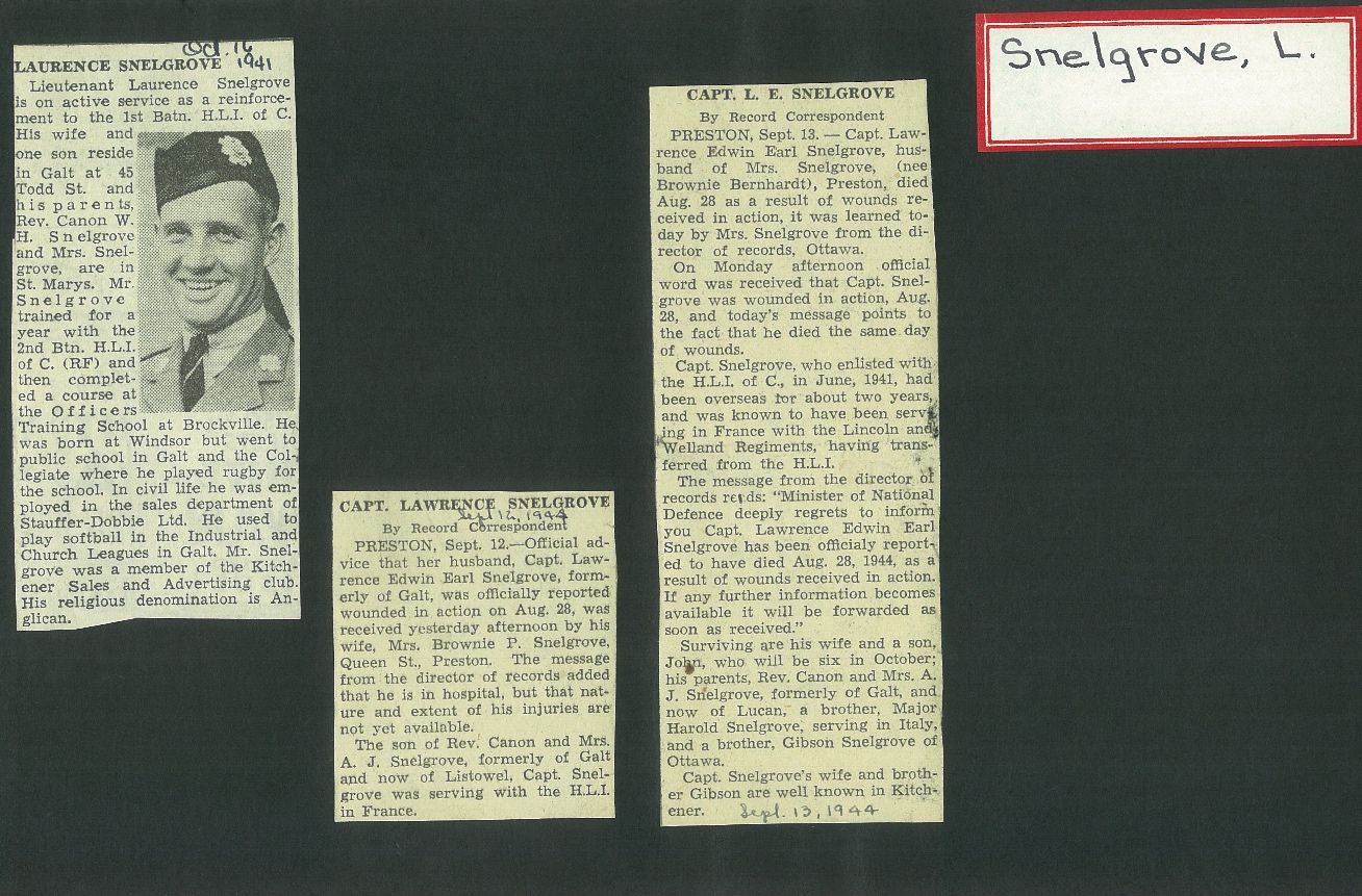 Fils de William Henry et Olive B. Snelgrove; époux de Brownie P. Snelgrove, de Galt, Ontario.