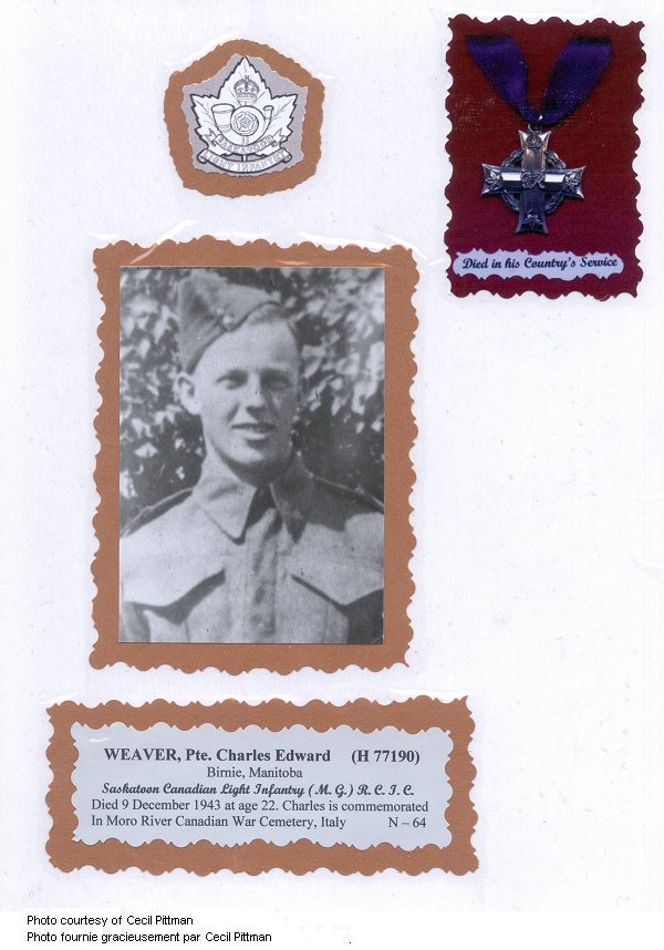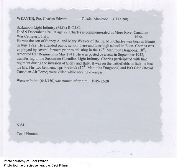 Frère du caporal G. M. Weaver, le lieutenant d'aviation Glen Mason Weaver, décédé au service de l'Aviation royale canadienne, et le cavalier Frederick Weaver,décédé au service du 12th Manitoba Dragoons, R.C.A.C.