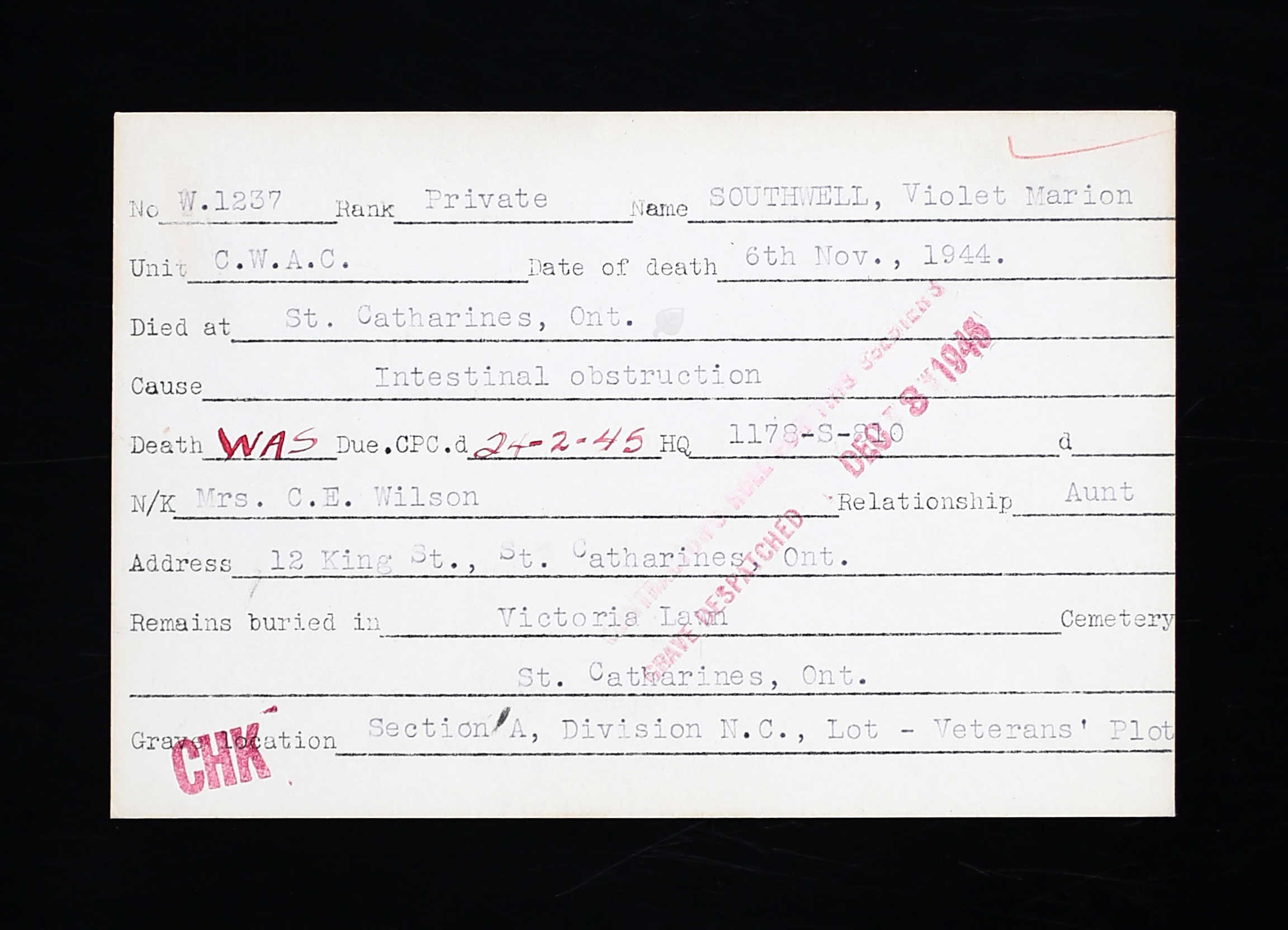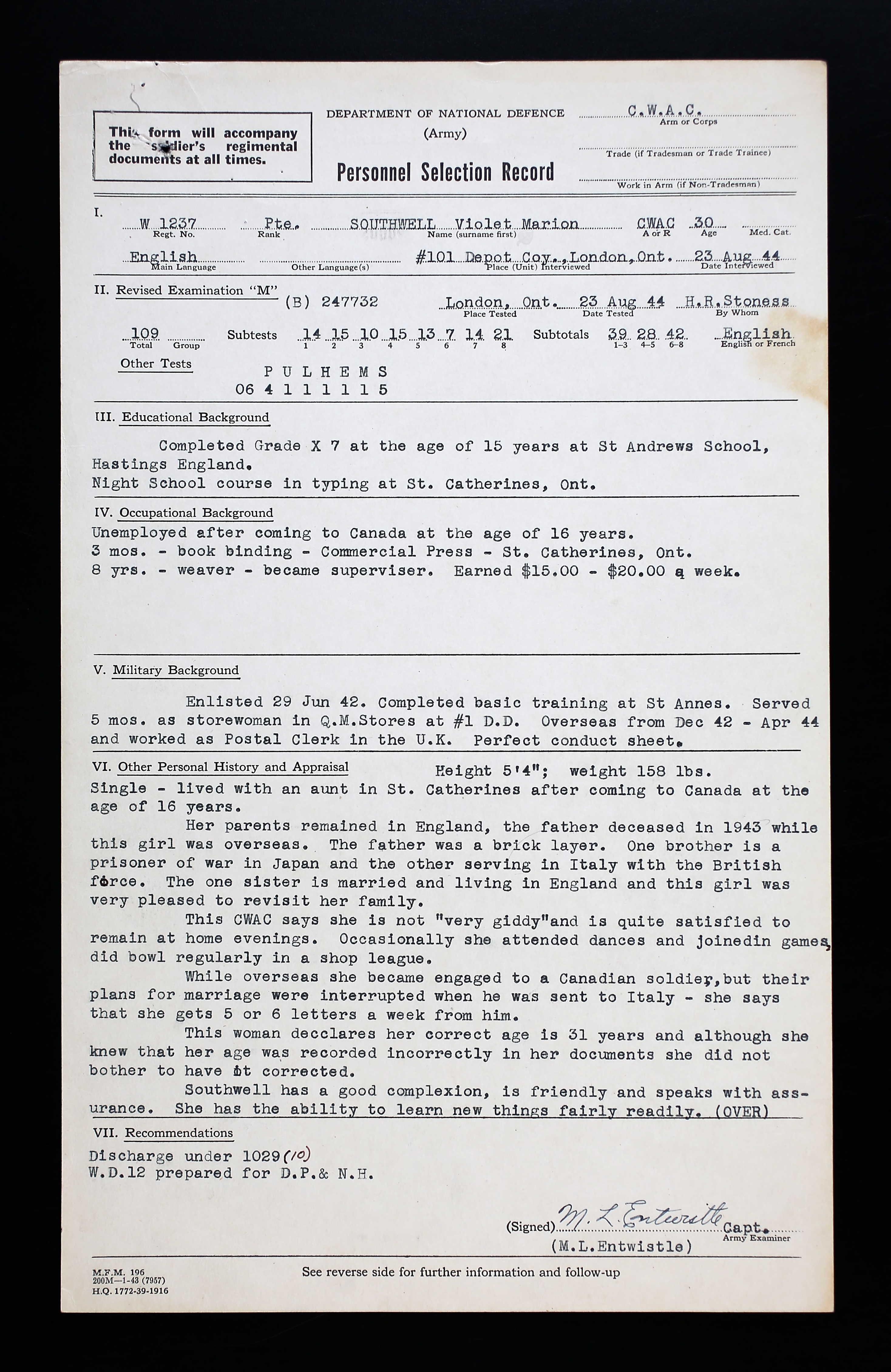 Unité/Régiment : Service féminin de l'Armée canadienne
