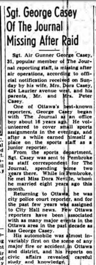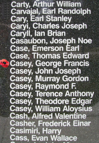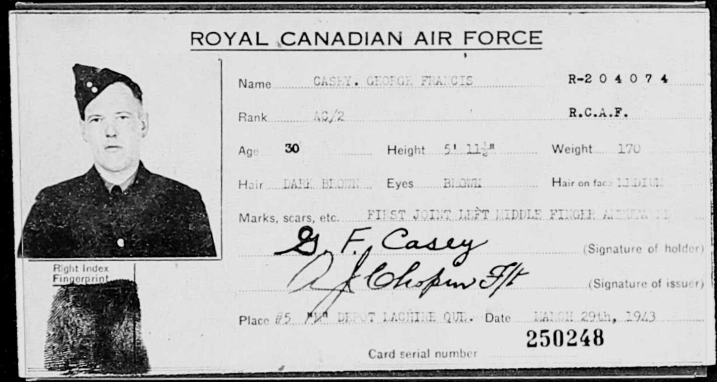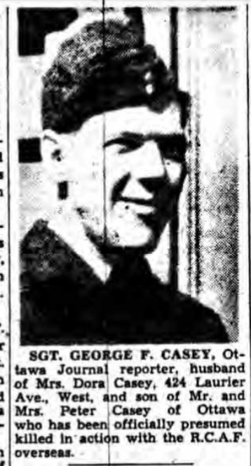 Frère du sergent Joseph J. Casey, matricule C-12629, de la 2e Brigade blindée du Canada, 84e Compagnie du Royal Canadian Army Service Corps. Il a survécu à la guerre.