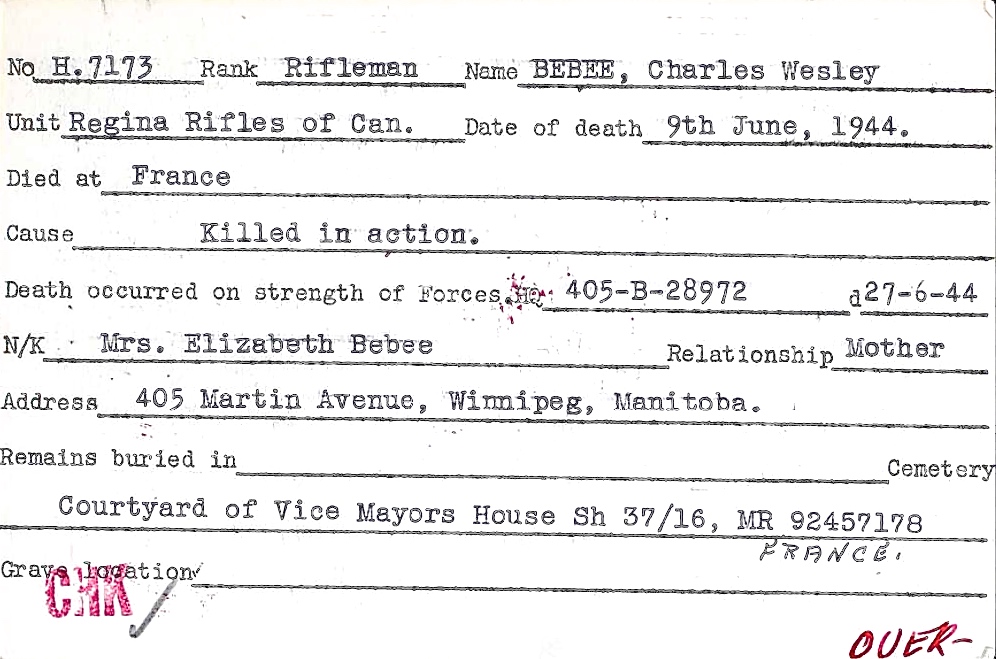 Les Canadiens qui sont morts vers la fin des combats en Normandie sont inhumés au cimetière militaire canadien de Bretteville-sur-Laize. Le cimetière militaire canadien de Bény-sur-Mer compte 2048 sépultures, ainsi qu'un monument spécial érigé à la mémoire d'un soldat du Corps canadien d'infanterie dont on sait qu'il a été inhumé ici, mais dont la tombe n'a jamais pu être trouvée.