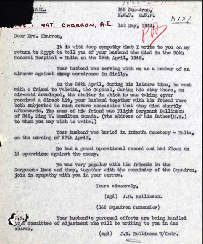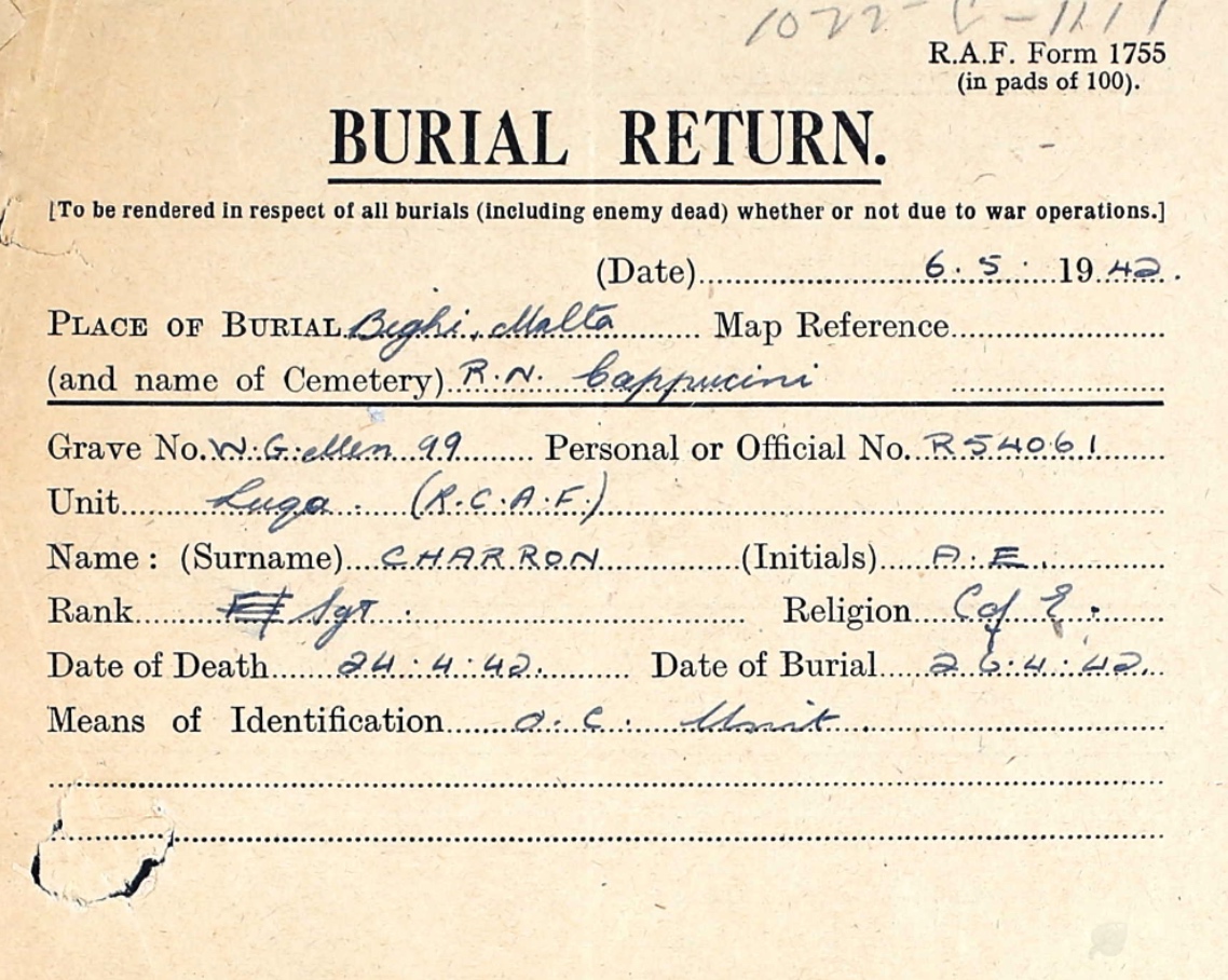 Il est décédé à l’hôpital des blessures subies le 24 avril 1942 lors d’un raid aérien allemand sur La Valette, Malte.
