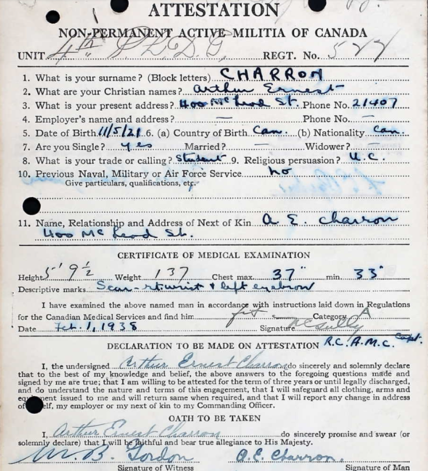 Il a été caporal suppléant, matricule 522, au 4th Princess Louise Dragoon Guards à Ottawa, Ontario, du 1er février 1938 au 18 juin 1941.