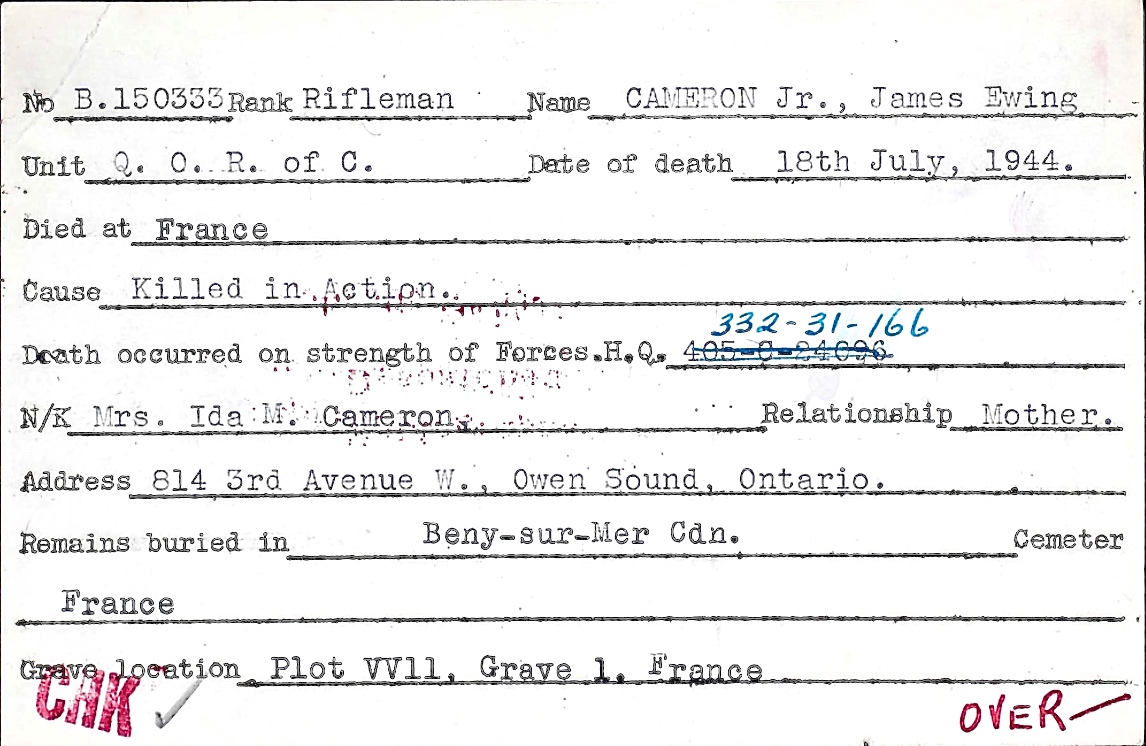 Les Canadiens qui sont morts vers la fin des combats en Normandie sont inhumés au cimetière militaire canadien de Bretteville-sur-Laize. Le cimetière militaire canadien de Bény-sur-Mer compte 2048 sépultures, ainsi qu'un monument spécial érigé à la mémoire d'un soldat du Corps canadien d'infanterie dont on sait qu'il a été inhumé ici, mais dont la tombe n'a jamais pu être trouvée.
