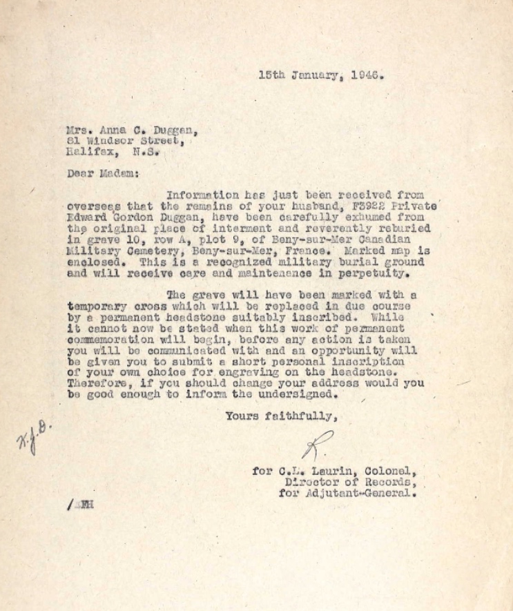 Les Canadiens qui sont morts vers la fin des combats en Normandie sont inhumés au cimetière militaire canadien de Bretteville-sur-Laize. Le cimetière militaire canadien de Bény-sur-Mer compte 2048 sépultures, ainsi qu'un monument spécial érigé à la mémoire d'un soldat du Corps canadien d'infanterie dont on sait qu'il a été inhumé ici, mais dont la tombe n'a jamais pu être trouvée.