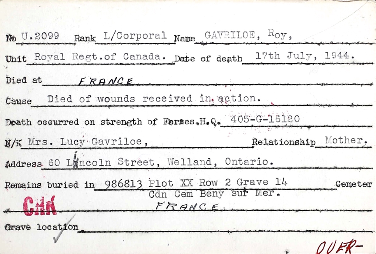 Les Canadiens qui sont morts vers la fin des combats en Normandie sont inhumés au cimetière militaire canadien de Bretteville-sur-Laize. Le cimetière militaire canadien de Bény-sur-Mer compte 2048 sépultures, ainsi qu'un monument spécial érigé à la mémoire d'un soldat du Corps canadien d'infanterie dont on sait qu'il a été inhumé ici, mais dont la tombe n'a jamais pu être trouvée.