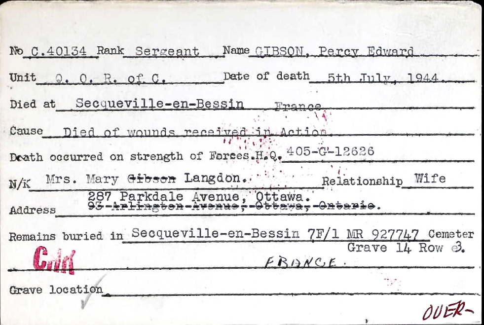 Les Canadiens qui sont morts vers la fin des combats en Normandie sont inhumés au cimetière militaire canadien de Bretteville-sur-Laize. Le cimetière militaire canadien de Bény-sur-Mer compte 2048 sépultures, ainsi qu'un monument spécial érigé à la mémoire d'un soldat du Corps canadien d'infanterie dont on sait qu'il a été inhumé ici, mais dont la tombe n'a jamais pu être trouvée.