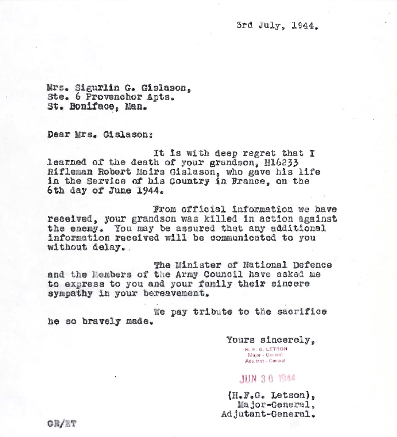 Les Canadiens qui sont morts vers la fin des combats en Normandie sont inhumés au cimetière militaire canadien de Bretteville-sur-Laize. Le cimetière militaire canadien de Bény-sur-Mer compte 2048 sépultures, ainsi qu'un monument spécial érigé à la mémoire d'un soldat du Corps canadien d'infanterie dont on sait qu'il a été inhumé ici, mais dont la tombe n'a jamais pu être trouvée.