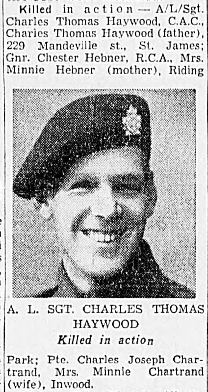 Fils de Charles Thomas Haywood et Ethel Haywood, de St. James, Manitoba.