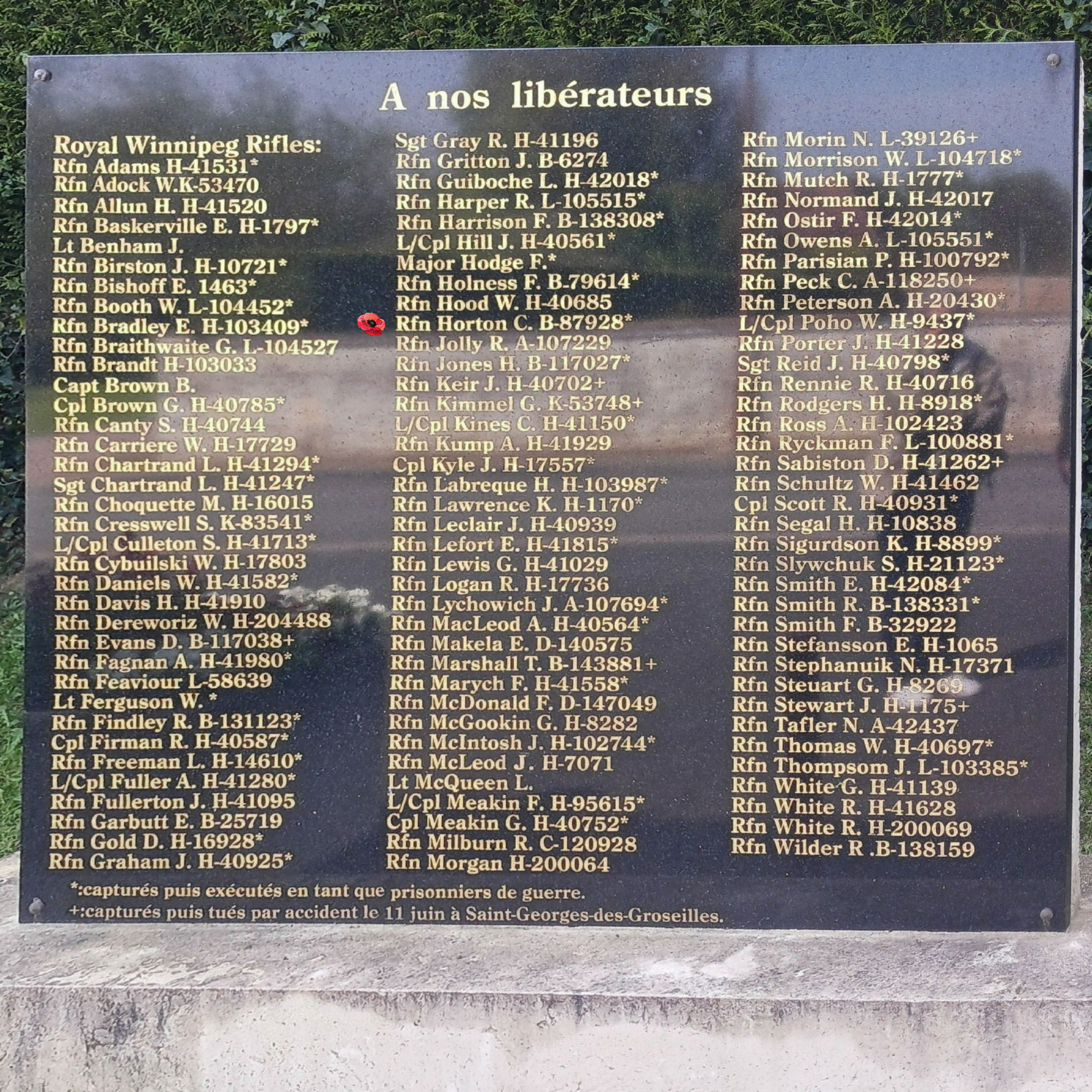 Les Canadiens qui sont morts vers la fin des combats en Normandie sont inhumés au cimetière militaire canadien de Bretteville-sur-Laize. Le cimetière militaire canadien de Bény-sur-Mer compte 2048 sépultures, ainsi qu'un monument spécial érigé à la mémoire d'un soldat du Corps canadien d'infanterie dont on sait qu'il a été inhumé ici, mais dont la tombe n'a jamais pu être trouvée.