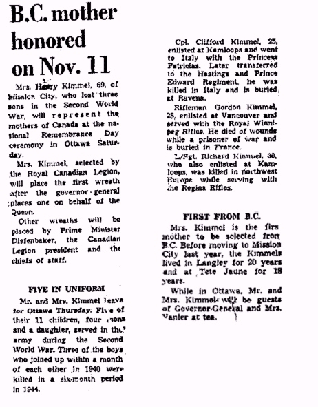 Fils de Harry Ellsworth et Sylvia Janet Kimmel (La Mère de la Croix du Souvenir (Croix d’argent) de 1961), de Milner, Colombie-Britannique.