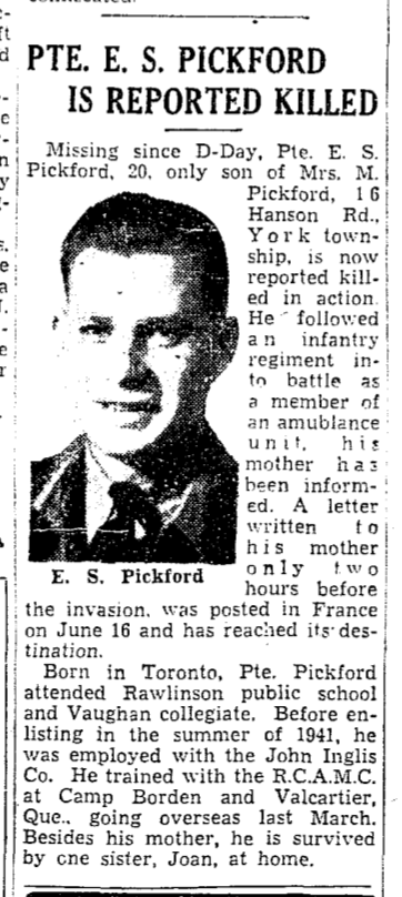 Les Canadiens qui sont morts vers la fin des combats en Normandie sont inhumés au cimetière militaire canadien de Bretteville-sur-Laize. Le cimetière militaire canadien de Bény-sur-Mer compte 2048 sépultures, ainsi qu'un monument spécial érigé à la mémoire d'un soldat du Corps canadien d'infanterie dont on sait qu'il a été inhumé ici, mais dont la tombe n'a jamais pu être trouvée.