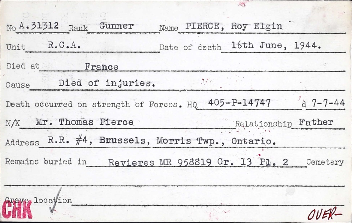 Les Canadiens qui sont morts vers la fin des combats en Normandie sont inhumés au cimetière militaire canadien de Bretteville-sur-Laize. Le cimetière militaire canadien de Bény-sur-Mer compte 2048 sépultures, ainsi qu'un monument spécial érigé à la mémoire d'un soldat du Corps canadien d'infanterie dont on sait qu'il a été inhumé ici, mais dont la tombe n'a jamais pu être trouvée.