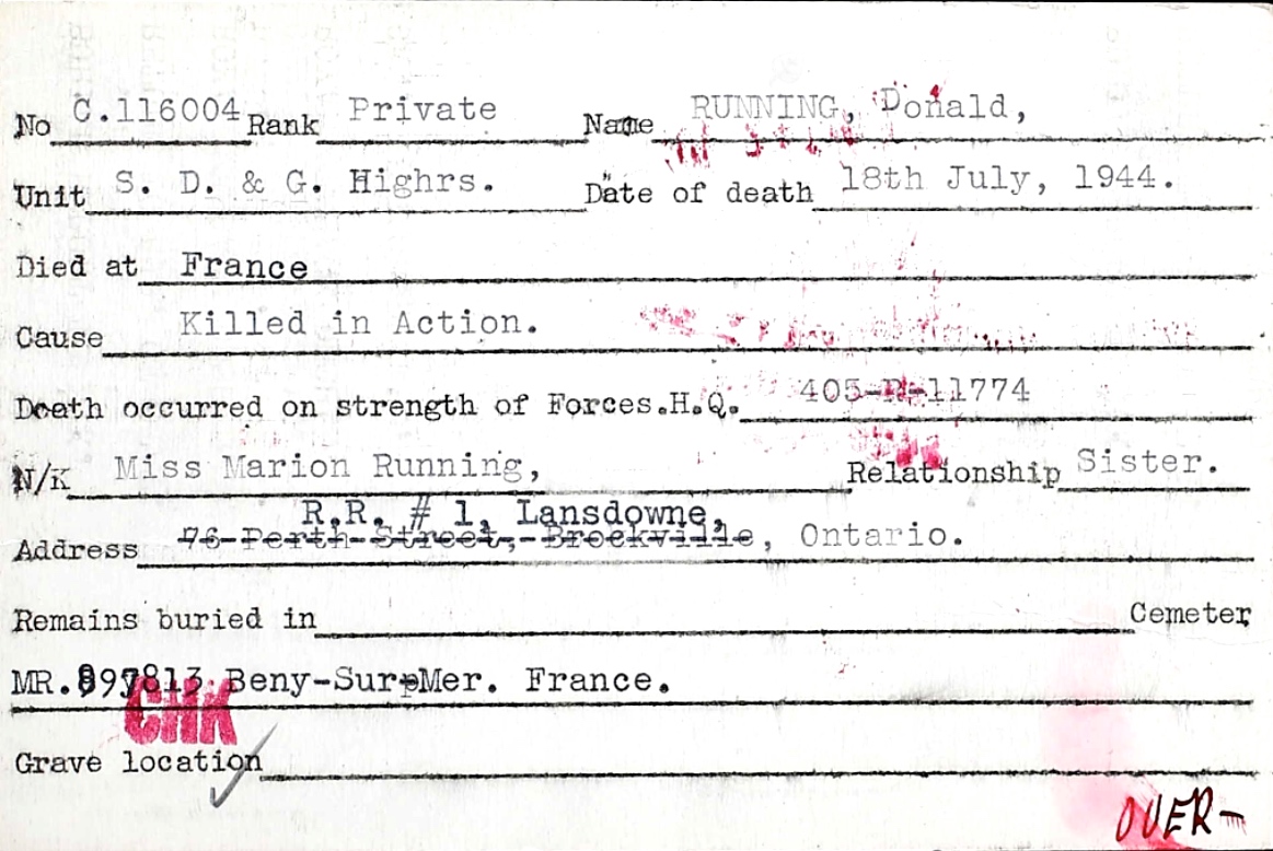 Les Canadiens qui sont morts vers la fin des combats en Normandie sont inhumés au cimetière militaire canadien de Bretteville-sur-Laize. Le cimetière militaire canadien de Bény-sur-Mer compte 2048 sépultures, ainsi qu'un monument spécial érigé à la mémoire d'un soldat du Corps canadien d'infanterie dont on sait qu'il a été inhumé ici, mais dont la tombe n'a jamais pu être trouvée.