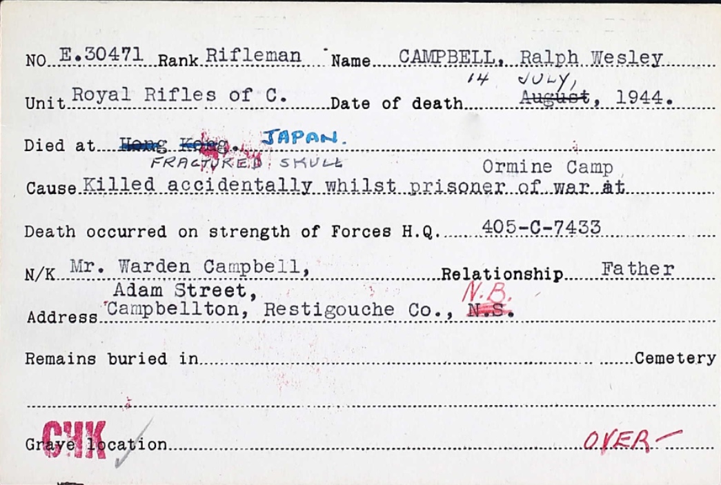 A servi au Québec et à Hong Kong avec la Force C, au Japon comme prisonnier de guerre. Il comptait 1 404 jours de service, dont 991 outremer.