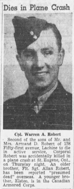 Frère du sergent de section Allan Dease Robert, décédé au service de l'Aviation royale du Canada.
