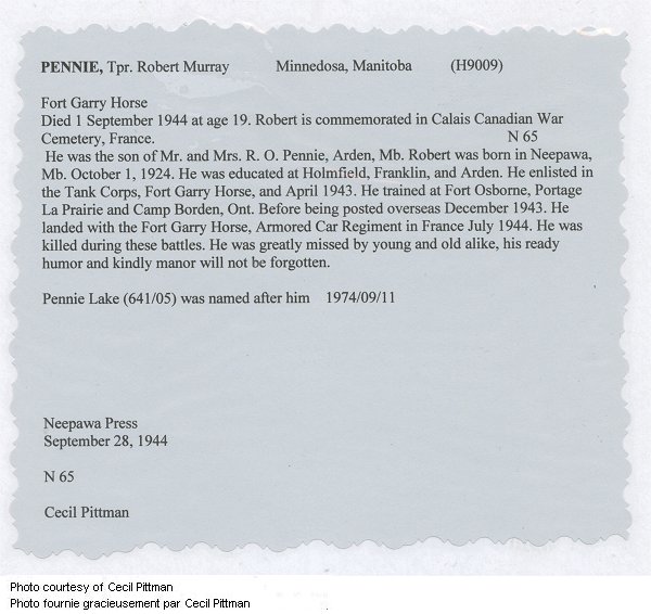 Fils de Robert Osmond Pennie et Olive Margaret Pennie, de Minnedosa, Manitoba.