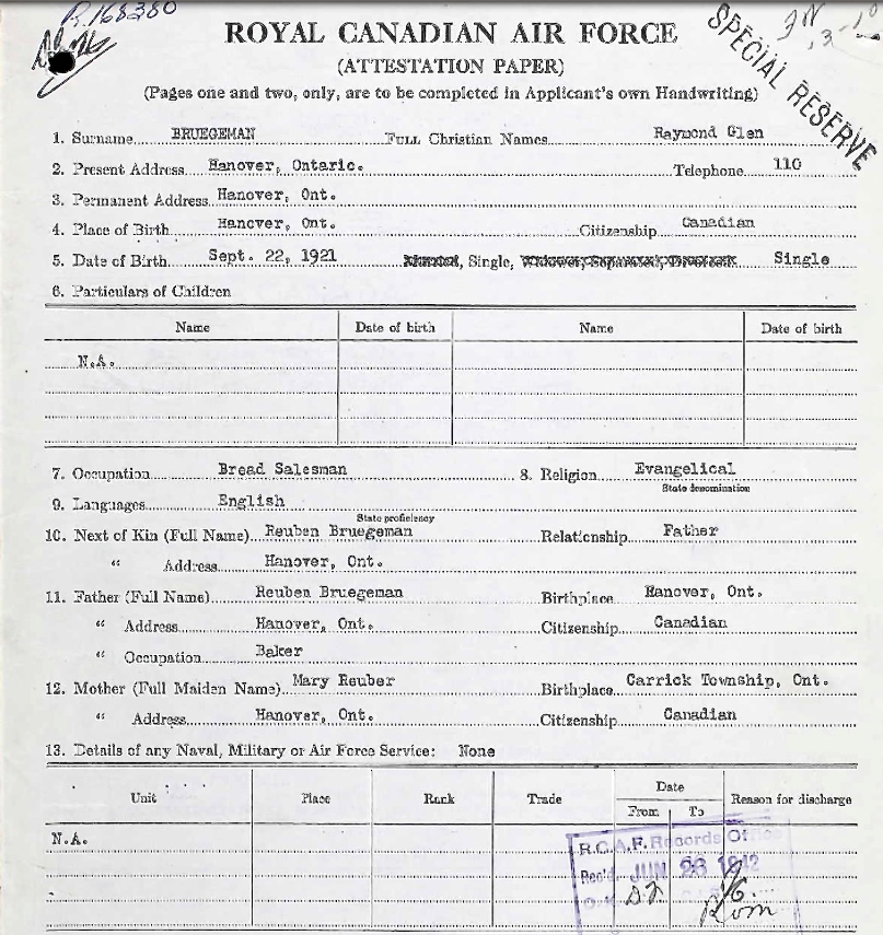 Fils de Reuben Ezra et Mary Alma Bruegeman de Hanover. Ontario. Époux de Dorothy Priscilla Bruegeman de Hanover.
