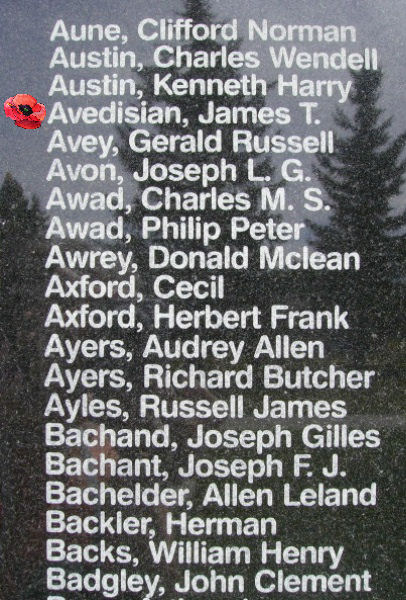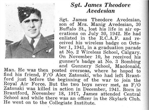 Le sergent James Avedisian a servi dans le 149e Escadron East India (Fortis Nocte). Son avion Stirling R9161fut abattu alors qu'il retournait d'un raid sur Saarbruck (Allemagne) et il s'est écrasé près de Regniowez (France). L'autre Canadien membre de l'équipage était le sgt avn Ernest J. LeBlanc de Saint-Joseph-du-Moine (près de Chéticamp), au Cap-Breton (Nouvelle-Écosse).