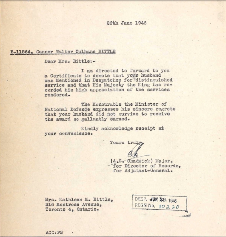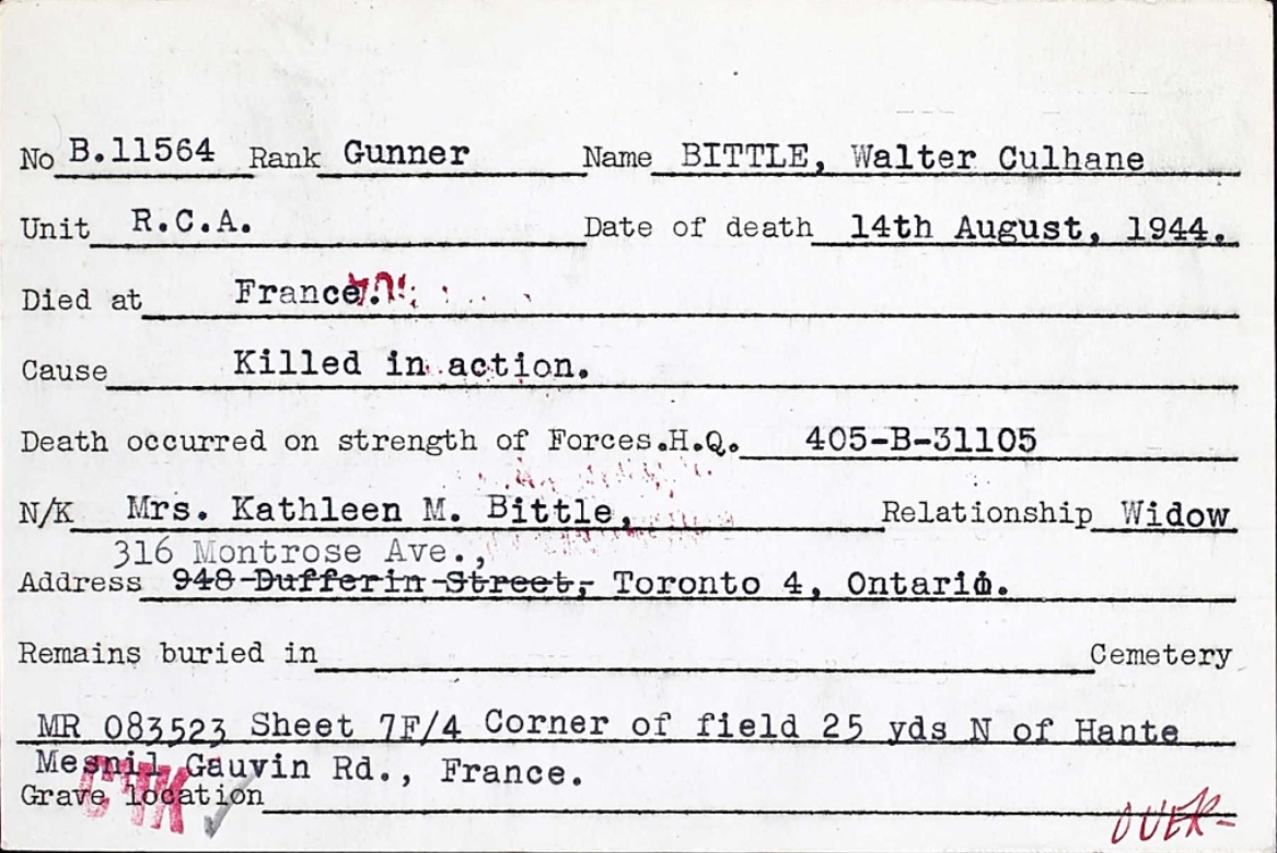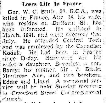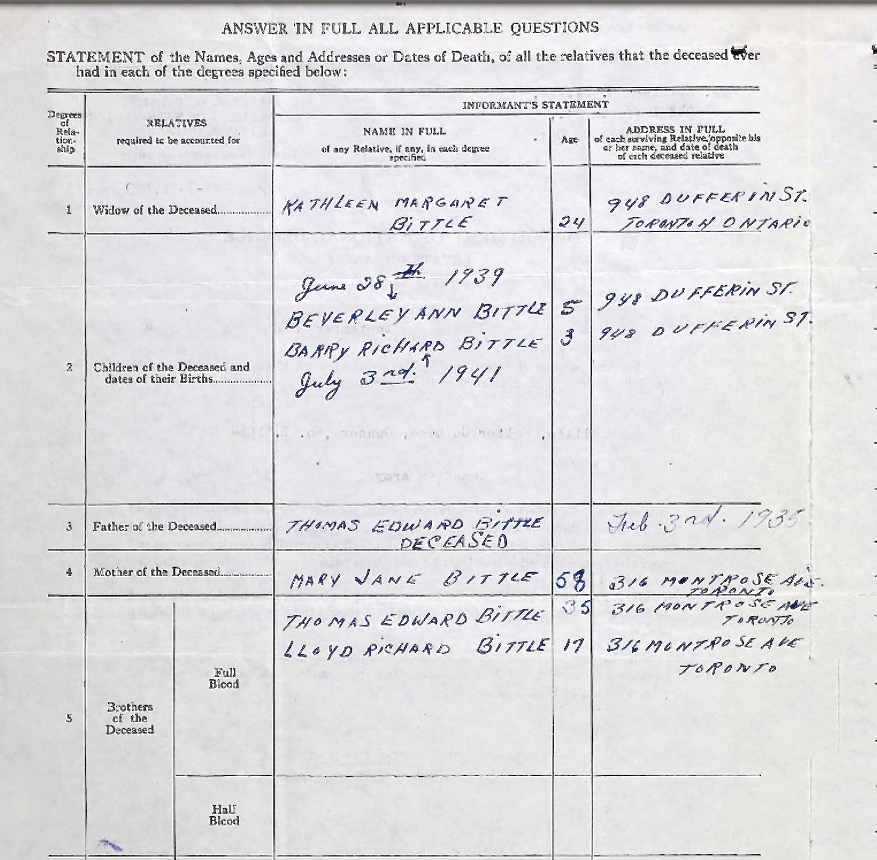 Fils de Thomas Edward et Mary Jane Bittle, de Toronto, Ontario. Époux de Kathleen Margaret Bittle, de Toronto.