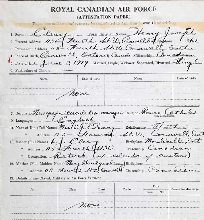 Fils de Edward J. et Mary Boulger Cleary, de Cornwall, Ontario.