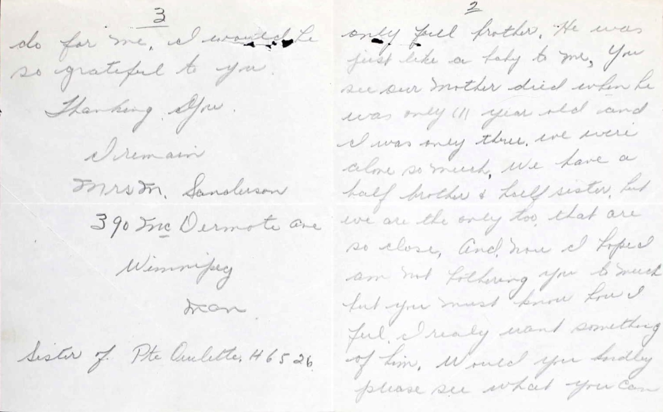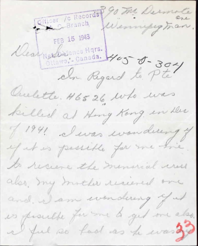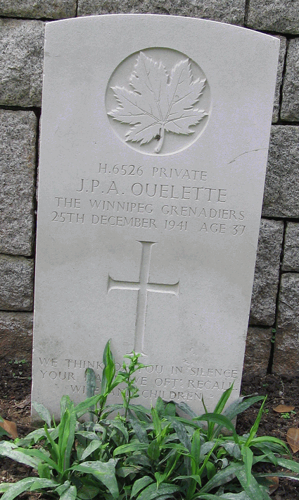 Demi-frère du soldat Frank W. Ouellette, matricule H-6500, qui a combattu en Europe, et beau-frère du soldat John Stephens, matricule H-6138, du 1er Bataillon du Winnipeg Grenadiers, prisonnier de guerre à Hong Kong et au Japon. Ils ont survécu à la guerre.