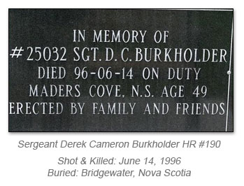 Il a laissé dans le deuil son épouse, Frances, et ses deux filles, Tammy et Tanya. Il s’agissait du premier meurtre d’un membre de la GRC en Nouvelle-Écosse. Le sergent Burkholder est inhumé au cimetière Brookside à Bridgewater, en Nouvelle-Écosse. Un tournoi de golf a lieu tous les ans pour honorer sa mémoire. Les profits du tournoi sont versés au Fonds commémoratif Sergent Derek C. Burkholder, qui a pour but de décerner des bourses à des finissants du secondaire.