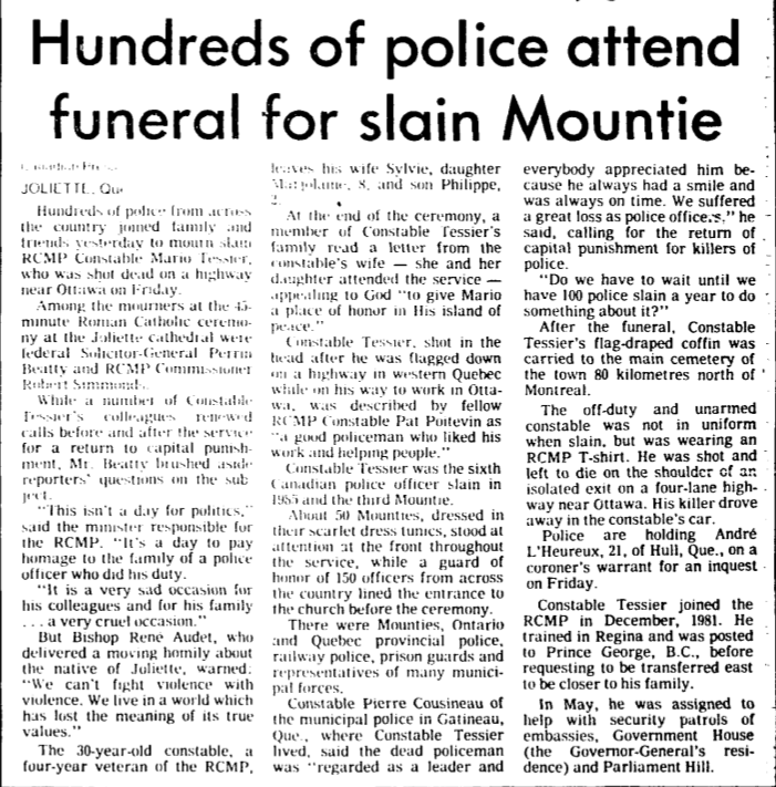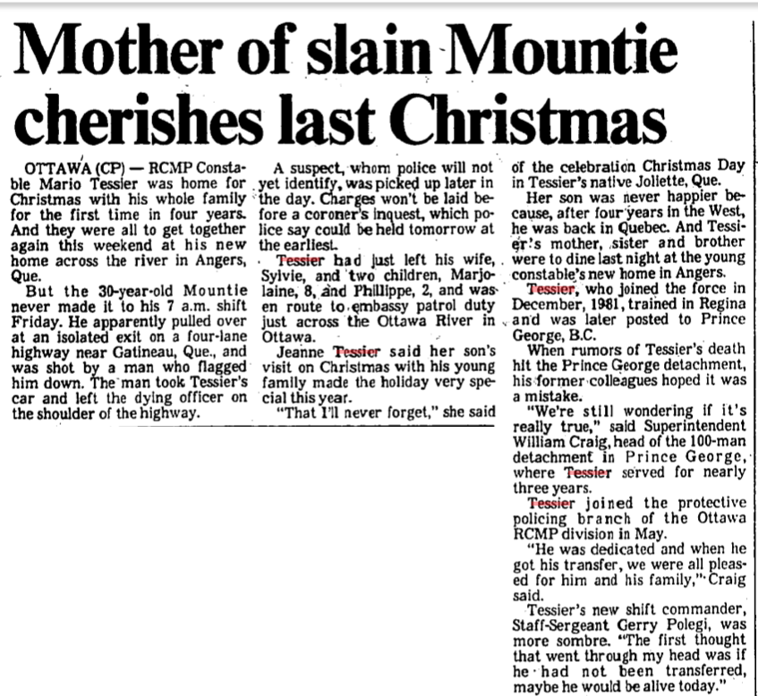 Le gend. Tessier est né à Joliette (Québec). Il a servi en Colombie-Britannique avant d’être muté à Ottawa. Le gendarme Tessier se rendait au travail lorsqu’il s'est arrêté pour aider un individu dont le véhicule était dans le fossé. L'homme est monté dans le véhicule du gendarme Tessier et il a tué le gendarme. Le gend. Tessier était marié à Sylvie et ils avaient un fils et une fille. Il est enterré dans le cimetière à proximité de l’église catholique, à Joliette (Québec).