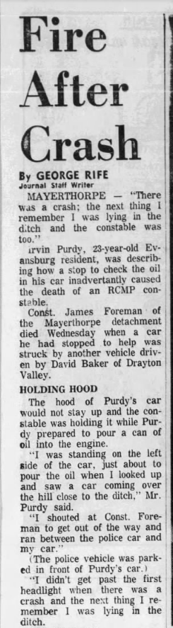 Le gend. Foreman est né en Saskatchewan. Il était marié à Lillian et ils avaient deux fils. Il est décédé des suites de ses blessures après avoir été frappé par une voiture sur l’accotement de l’autoroute près de Sangudo (Alberta), en voulant venir en aide à un automobiliste qui avait des ennuis. Le gend. Foreman était un tireur exceptionnel et a gagné le prix Minto Revolver Cup en 1953. Il est enterré à Evergreen Memorial Gardens, à Edmonton.