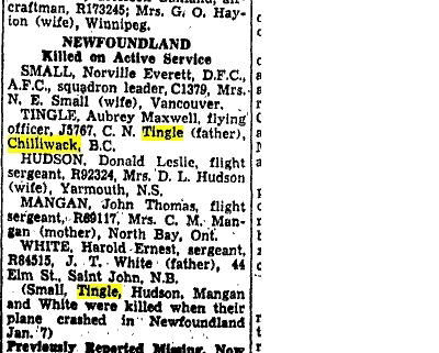 Fils de Cyril N. Tingle et Beryl B. Tingle, de Chilliwack, Colombie-Britannique.