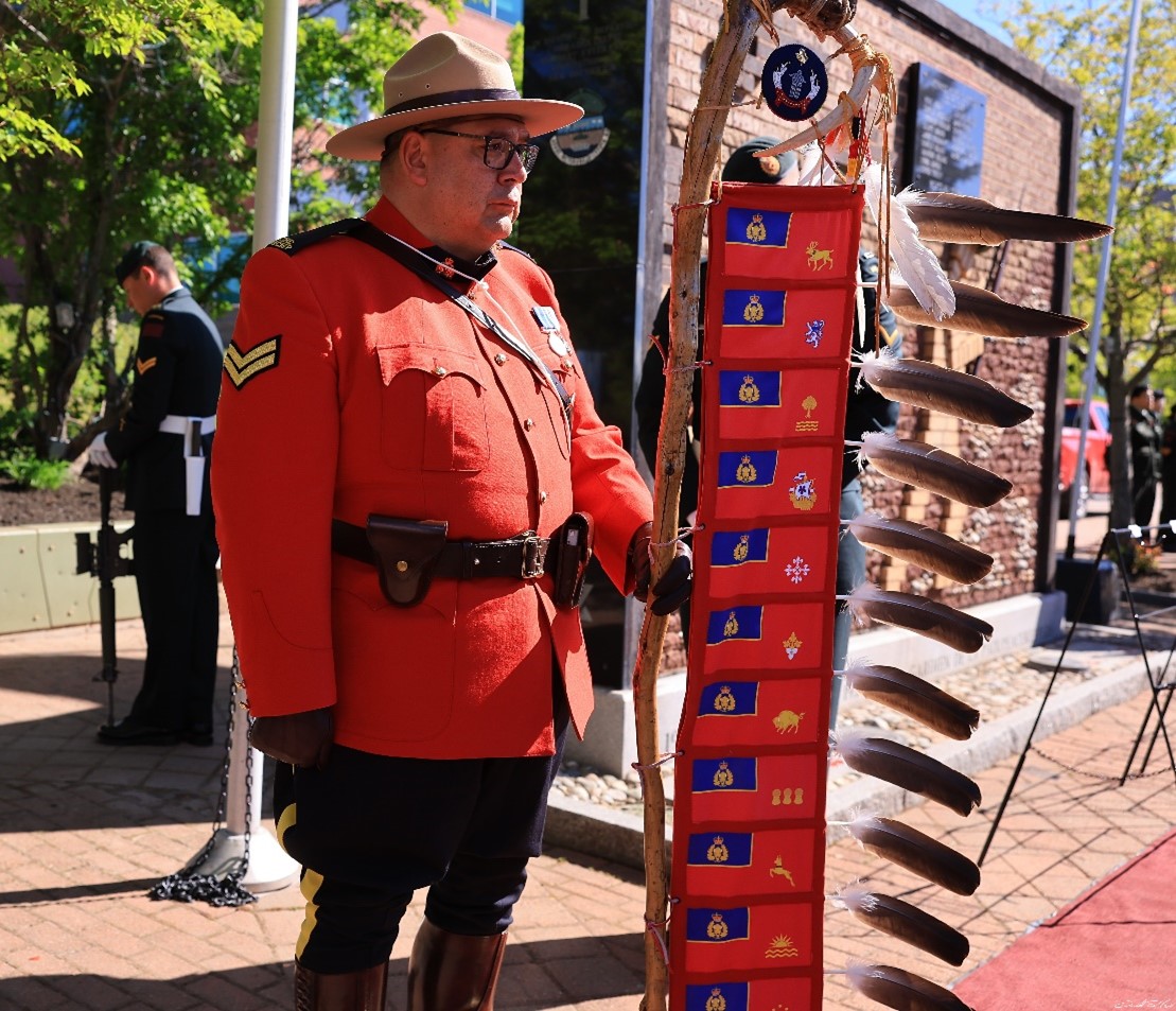 Le caporal Larry McDonald, porteur du bâton à exploits de la GRC, tient le bâton à exploits autochtone à côté d’un cénotaphe à Dieppe, au Nouveau-Brunswick, le 5 juin 2024.