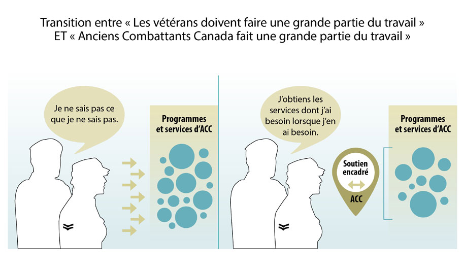 Il était clair que le Ministère avait besoin d’amorcer un changement fondamental dans sa façon d’accompagner les hommes et les femmes qui ont servi notre pays et comptent sur nos services. De nombreux vétérans estiment qu’ils ne profitent pas pleinement des services et des avantages, parce qu’ils ne sont pas au courant de ce qui existe ou tout simplement parce qu’ils ne savent pas quelles questions poser.