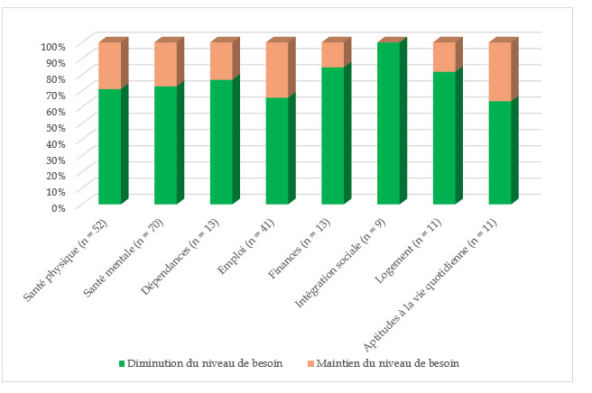 Les résultats associés à chaque domaine, fondés sur la situation initiale des vétérans par rapport à leur situation actuelle ou à leur situation au moment de la clôture du plan d’intervention, sont présentés dans le graphique ci-dessous.