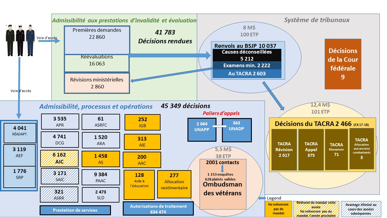 Ce graphique présente le nombre de décisions rendues par les programmes d’ACC, le TACRA et la Cour fédérale. Il indique également le nombre de cas traités par le BSJP et le BOV. Le graphique comporte trois sections : Admissibilité aux prestations d’invalidité et évaluation; Système de tribunaux; et Admissibilité, processus et opérations.