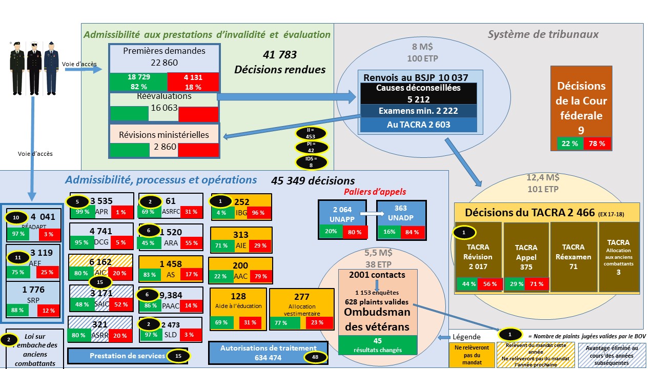 Il est également à noter que le rôle du BOV se limite au règlement des plaintes des vétérans qui ne concernent que des décisions qui sont hors du champ de compétence du TACRA et qui ont fait l’objet d’une révision ministérielle. Par ailleurs, en raison de son mandat, les types de décisions que le BOV peut examiner sont limités aux domaines suivants :