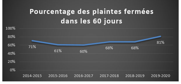 - En ce qui concerne les délais d’exécution, le pourcentage de cas fermés dans les 60 jours est passé de 61 % en 2015-2016 à 81 % à ce moment-ci de 2019-2020.