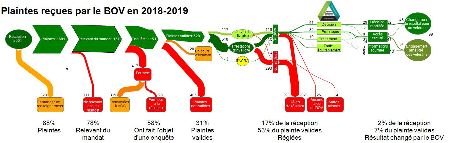 Ce graphique décrit l’incidence du BOV sur les cas individuels. On a créé un diagramme de Sankey pour illustrer le déroulement d’un cas depuis le contact initial du client avec le BOV jusqu’à son règlement.