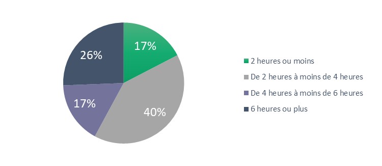 Les entrevues menées auprès du personnel de première ligne et du personnel de l’Administration centrale ont révélé que le FUV crée un lourd fardeau administratif (tant pour les personnes qui servent directement les vétérans que pour celles qui gèrent le programme). Fait particulièrement préoccupant, 43 % des employés de première ligne interrogés ont indiqué qu’il faut quatre heures ou plus pour rendre une décision relative au FUV. Ils ont fait remarquer que les décisions liées à d’autres programmes d’ACC ayant des répercussions financières plus importantes sont beaucoup plus faciles à prendre et à documenter. La figure 8 présente une ventilation du temps estimatif nécessaire pour rendre une décision concernant le FUV.